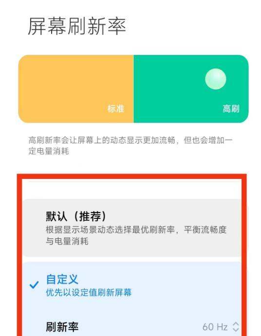 步骤4:调整刷新率在屏幕刷新率页面中,根据需求选择合适的刷新率(如60Hz、90Hz、120Hz等),系统会自动应用设置。