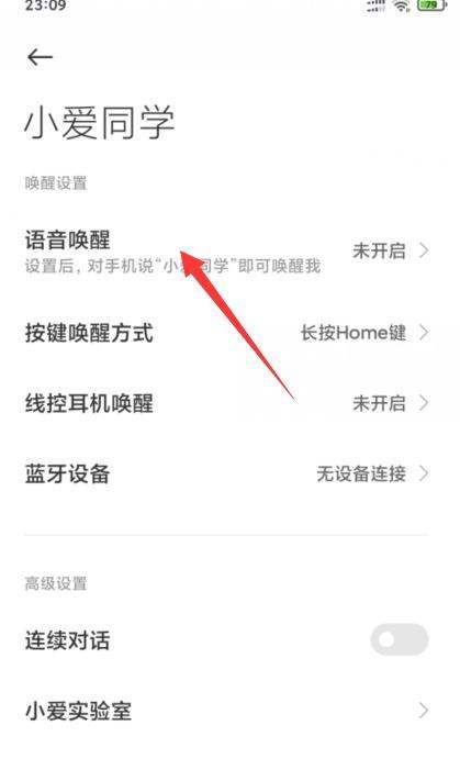 小米小爱同学设置语音唤醒的步骤如下: