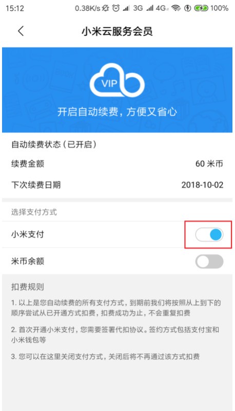 6、点击关闭小米云服务自动续费按钮开关;