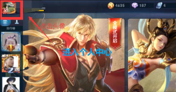 1、首先在手机上启动“王者荣耀”这一款游戏,进入游戏页面后点击左上角的游戏头像。