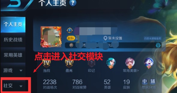 2、在游戏的个人主页中,点击左侧的模块导航中的“社交”这一选项,进入社交模块。