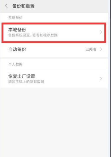 2,在“备份与重置”界面中,可以看到“本地备份”选项,点击此“本地备份”项即可进入小米手机备份及恢复界面。