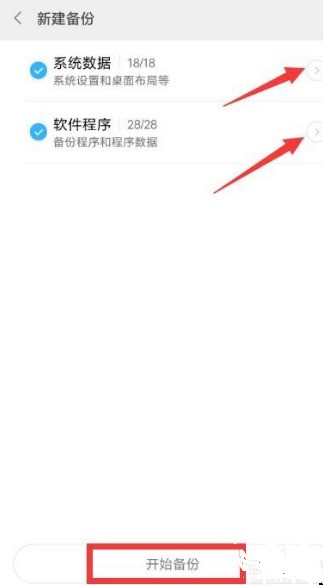 4,接下来将弹出“备份选项”界面,在此可以针对“系统备份”和“程序备份”进行更加详细的选择,待确认后点击“开始备份”按钮。