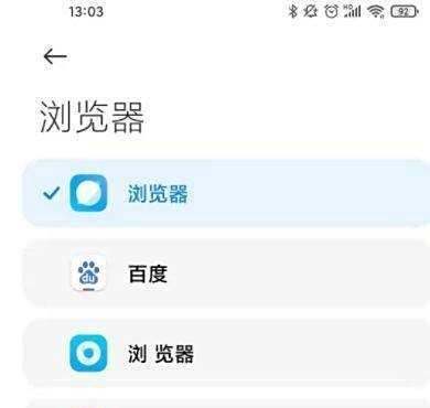 选择目标浏览器在默认应用列表中找到「浏览器」选项,点击后会显示已安装的所有浏览器应用,从中选择需要设为默认的应用即可。