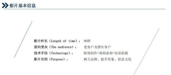 一、明确目的核心目标:需明确TVC的用途(如企业形象宣传、产品推广、技术创新展示、广告投放或公益宣传),并针对目标受众的画像(年龄、职业、消费能力、兴趣偏好等)设计内容。示例:若目标为推广一款面向中老年人的健康食品,需避免使用游戏化或科幻风格,转而采用贴近其生活场景的叙事方式,以增强共鸣。