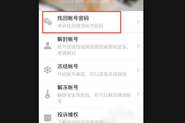 4、接着再在【微信安全中心】页面点击【找回帐号密码】功能按键。