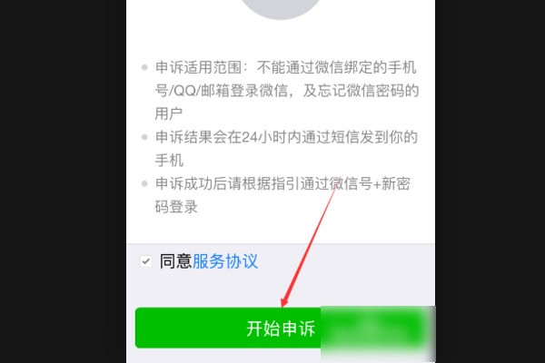 6、进入到【申诉找回微信帐号密码】页面后,在这里我们会了解到什么情况下可以进行申诉,以及申诉结果会在24小时告知我们等信息。然后点击页面底部的【开始申诉】按键。