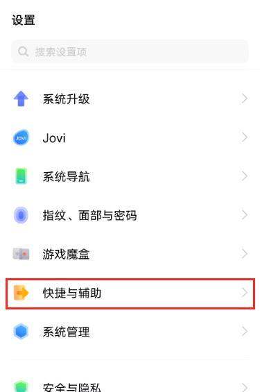 定位快捷与辅助选项:在设置列表中滑动查找,点击【快捷与辅助】选项,进入功能管理页面。