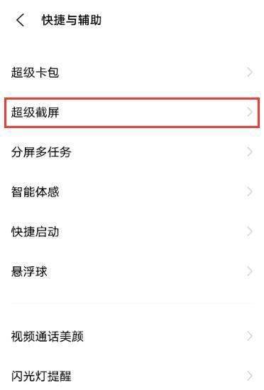 进入超级截屏设置:在快捷与辅助界面中,找到并点击【超级截屏】功能,进入截屏相关设置界面。