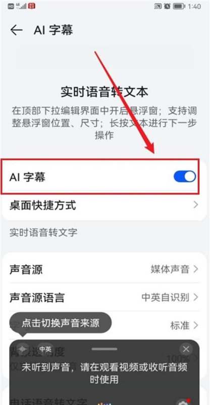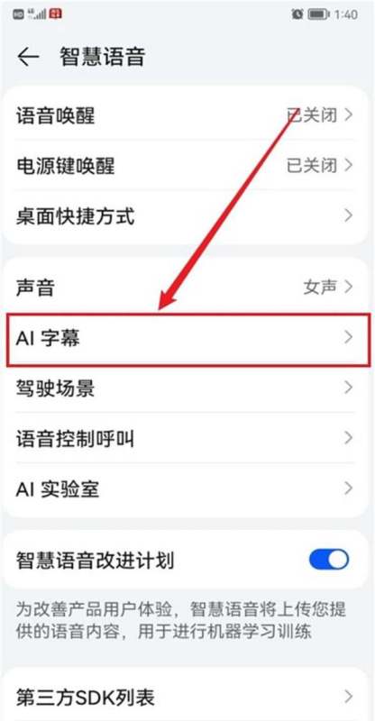 开启AI字幕功能在智慧语音界面中,直接找到AI字幕选项并点击,进入功能开关页面。