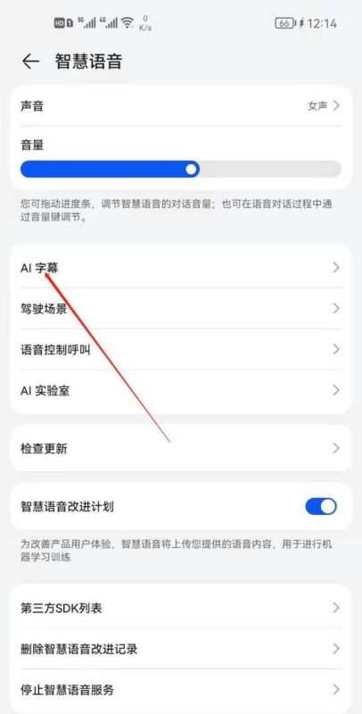 进入【AI字幕】设置项:在智慧语音设置页面中,找到【AI字幕】选项并点击,进入AI字幕功能设置页面。