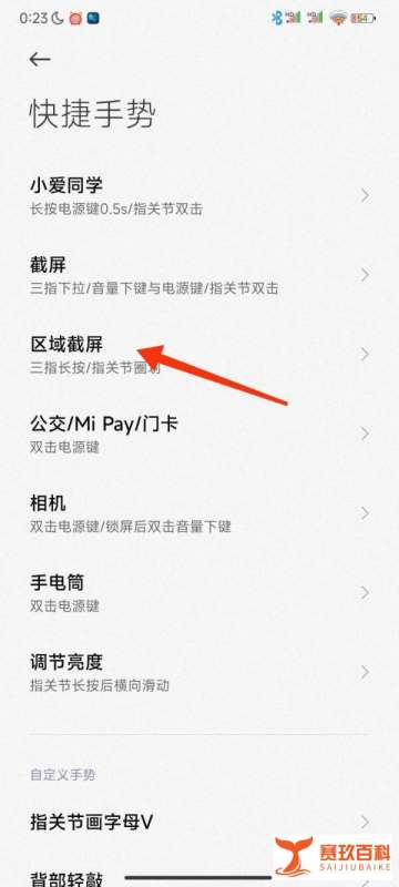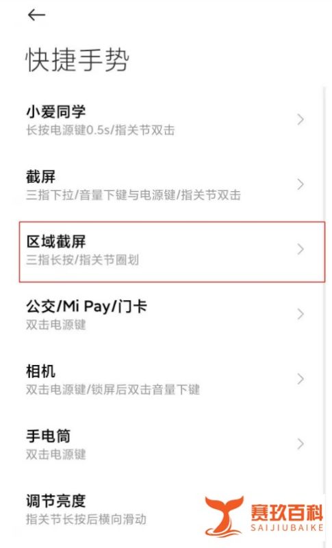进入区域截屏在快捷手势页面中,仔细查找并点击区域截屏选项,以此进入区域截屏的设置界面。