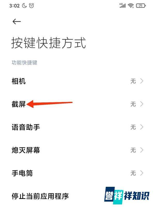 第三、选择截屏功能在“按键快捷方式”页面中,找到并点击“截屏”选项,进入截屏手势设置界面。