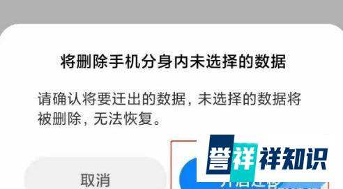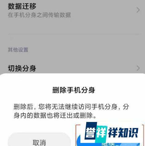 确认删除并处理数据点击提示框中的继续按钮后,系统会提供数据迁移选项。用户可选择将分身内的照片、联系人等重要数据迁移至主空间,避免永久丢失。