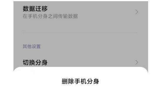 执行删除操作在手机分身设置页面底部找到删除手机分身按钮,点击后系统会弹出确认提示框,告知删除后分身内所有数据将被清空。
