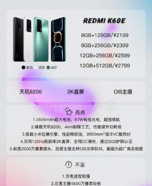 Redmi K60E:电池容量稍大,为5500mAh,但充电功率为67W,相对较慢。