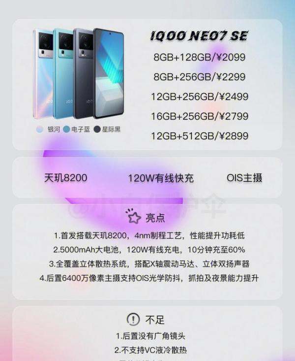 这些配置使得iQOO Neo7 SE在性能、屏幕显示、充电速度以及拍照能力等方面都有不错的表现,预计会在市场上受到一定的关注。