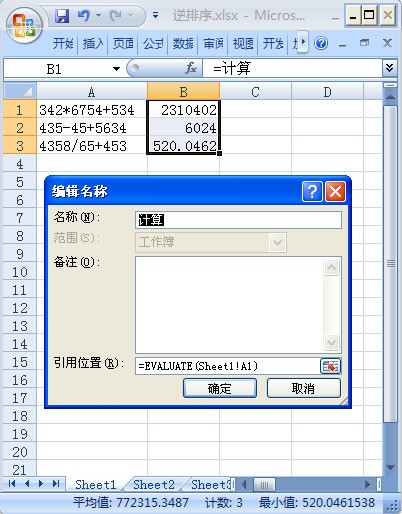 名称:“计算”;引用位置:“=EVALUATE(Sheet1!A1)”