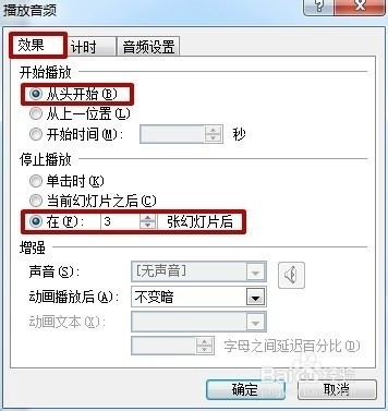6.在弹出的“播放音频”选项卡里,“效果”选项框中的“开始播放”选择“从头开始”,“停止播放”选择“在3张幻灯片后”。