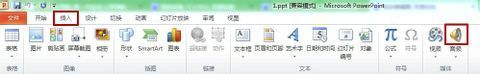 2.在“功能区”选择“插入”选项卡,在“插入”选项卡里,单击“音频”的上半部分按钮,直接从硬盘中选取音频文件。
