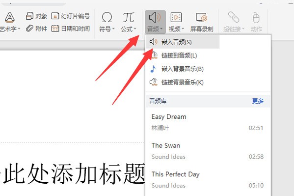11、选择音频的下拉箭头,选择嵌入音频进入。