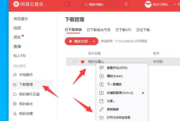 7、等待音乐文件下载完成以后点击下载管理,可以看到该被下载的音乐。点击右键选择打开文件所在的目录按钮进入。