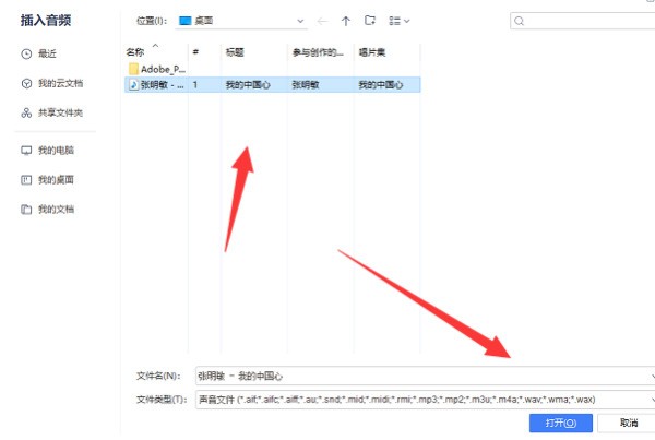 12、在出现的对话框中选中之前移动到桌面的音乐文件,点击打开按钮。