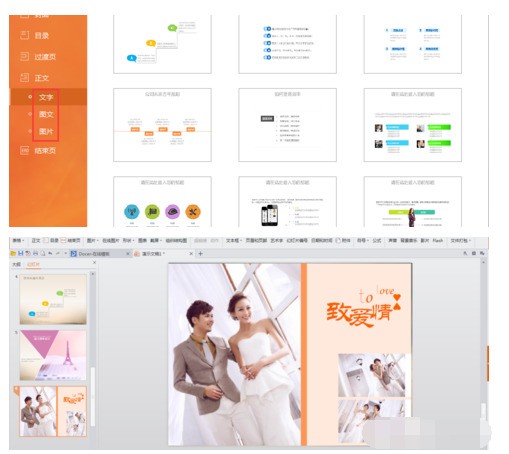 6.准备工作结束之后,接下来就是开始设计正文内容了,为了保证PPT课件的漂亮美观,只有单调的文字是远远不够的,还应图文并茂,点击【正文】选载项,选择合适的文字架构及图片,如下图所示。
