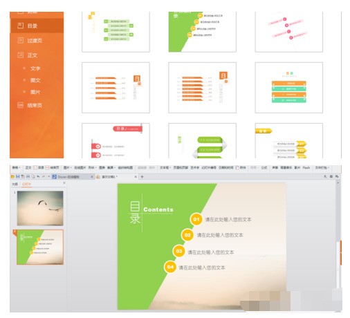 4.封面选择完毕之后再点击【目录】选项,为自己的PPT选择一个漂亮的目录吧,如下图所示。