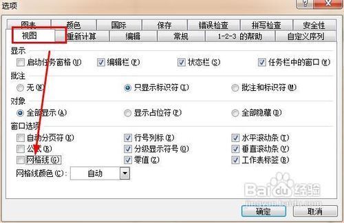 16、在视图选项下,我们取消勾选网格线,如下图所示的位置。然后点击确定。
