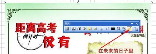 3、我们插入了一张刚刚下载的高考倒计时的图片。然后点击照片工具栏上的透明工具,如下图所示的地方,点击就能启动工具