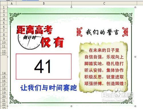 6、先将图片放到一边待用,我们定位到单元格B14,这个单元格的位置与图片中的倒计时的方块的位置是差不多的,调整行高和列宽是的单元格B14的大小与图片中方块的大小类似。