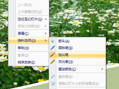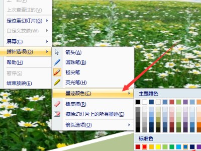 2、点击鼠标右键,点击指针选纤洞项,点击墨迹颜色,对墨迹的颜色进行设置。