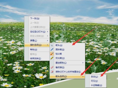 1、放映PPT,点击鼠标右键,点击指针选项,选择右边圆珠笔、毡尖笔、荧光笔任意一个,可在屏幕上圈画。笔者以旋转毡尖笔为例。
