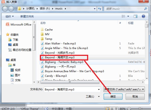 4、接着在跳出的对话框内点击要进行插入的音乐文件,选好后,点击下方的“确定”选项,就完成插入背景音乐了。