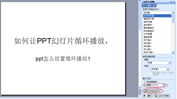 第一页点「幻灯片放映」→「幻灯片切换」→ 效果、换页按需调;重点来了