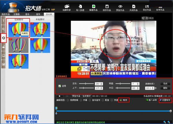 具体步骤: step1:进入拍大师的创作视频界面。我们将【主画面】的视频素材拖到编辑区域。如果还没有就用拍大师录制视频素材。将素材视频的时间轴选取好,确定在时间轴上面的某一点添加“马赛克”特效。