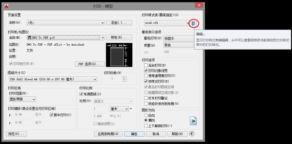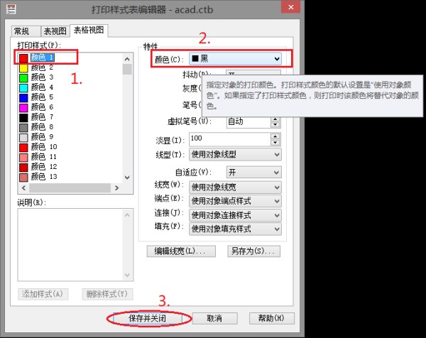 单击“打印样式表”右侧的“编辑”按钮,打开“打印样式表编辑器”对话框,如图所示,在左侧“打印样式”列表中单击选中颜色,再将右侧“特性”里的“颜色”设置为“黑色”(可以按住Shift键选中列表中的所有裂英况常亚颜色,再统一设置为黑色。),单击“保存并关闭”按钮关闭对话框。