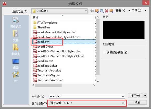 文件-打开,打开“选择文件”对话框,如图所示,设置“文件类型”为“图形样板(*.dwt)”,单击“acad.dwt”使其高亮显示,单击“打开”按钮关闭对话框。