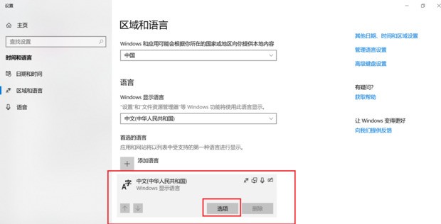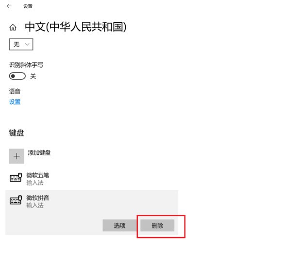 然后再返回上一步,点击“中华人民共和国”——选项——将微软拼音删除。