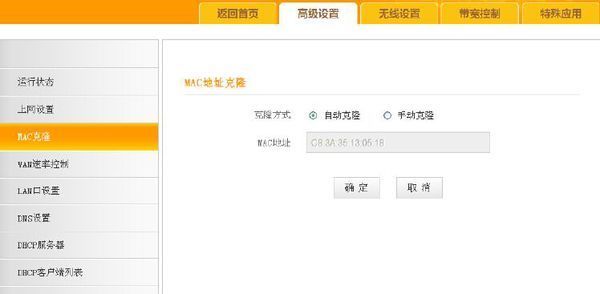 点击高级设置-MAC克隆,手动克隆-克隆mac地址,看到地址不是C限阻衣8:3A:35开头的就点击确定。(克隆时需要拿网线连接电脑与路由1/2/3接口任意一个,不要连接路由的无线信号)