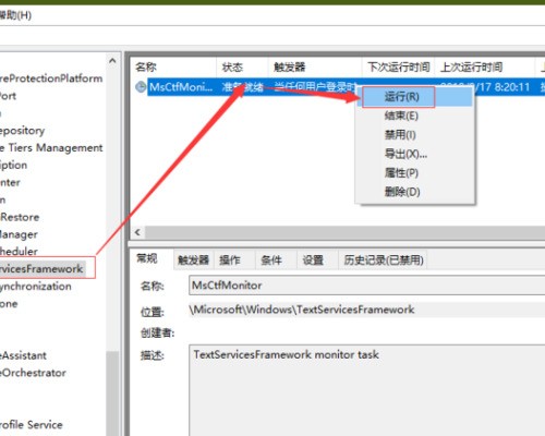 6、最后在”TextServicesFramework“的右侧”MsCtfMonitor“中右击弹出如图所示界面,点击运行即可。