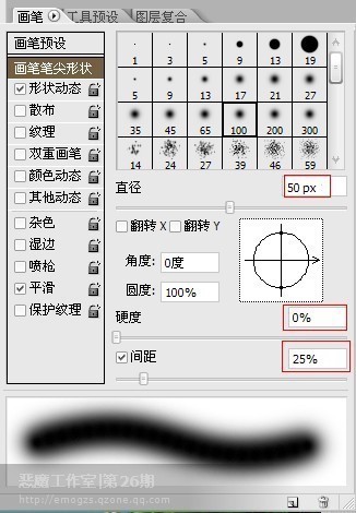 3。选择“画笔工具”,按F5切换到“画笔”面板,并对其“笔尖形状”设置成大小50PX(即50象素),硬度0