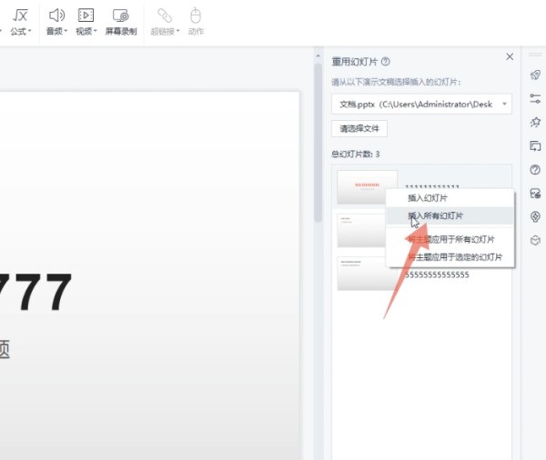 6、点击插入所有幻灯片在弹出的选择菜单里面点击第二个插入所有幻灯片的选项,这样就可以直接将两严善被个PPT合并在一起了。