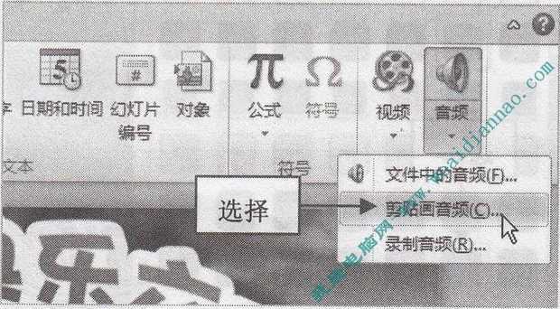 步骤2:切换至“插入”面板,在“媒体”选项板中,单击“音频”下拉按钮,在弹出的列表中选择“剪贴画音频”选项,如下图