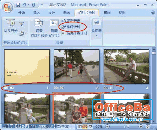 今天,偶然看到一篇介绍PPT2007的文章,找到了解决办法。打开PPT文件,点“幻灯放映”菜单,里面有一个“排练计时”选项。点击此选项后,幻灯片按预览方式开始播放,在屏幕的左上角,有一个时间控制窗口,时间按秒计算。自己可以决定该页面的停留时间,当觉得合适的时候,就按回车键,继续下一页的播放时间控制。