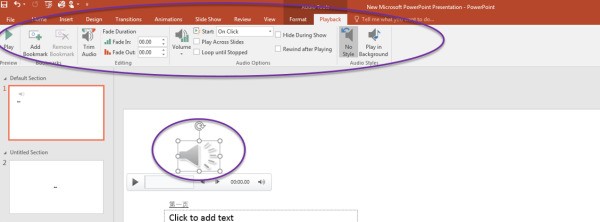 3、这时,可以看到在PPT上多了一个音频小喇叭,点击一下这个小喇叭,可以转到这个音频的相关设置,可以根据需要选择显示/隐藏图标,调节音量,背景播放等等场景功能。