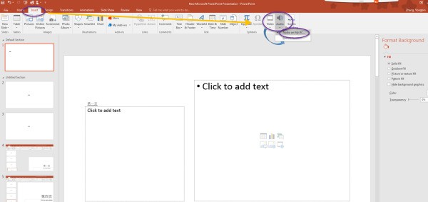 1、点击开始,插入,然后选则音频,选择下面的此PC的音频(Audio on my PC)。