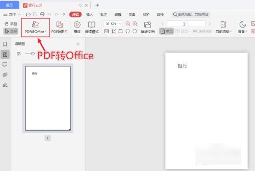 1、电脑使用WPS打开pdf文件,再点击“PDF转office”。