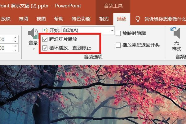 4、最后,分别检查“交叉滑盖播放”和“循环播放直到停止”,从而解决PPT背景音乐循环播放的问题。